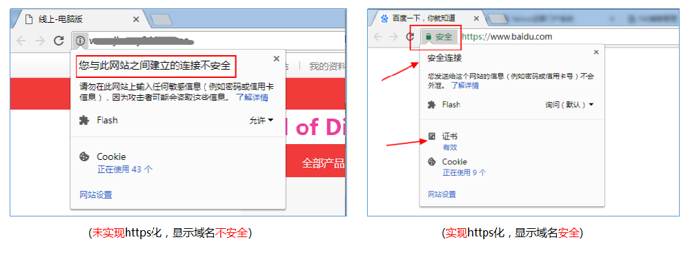 运用https安全功能,可在各大主流浏览器中,显示浏览器安全图标,有助于提升品牌形象和可信度。据统计,各大权威站点例如百度、腾讯、阿里巴巴等,域名https化实现率高达80%,升级https将成为网站的标配。